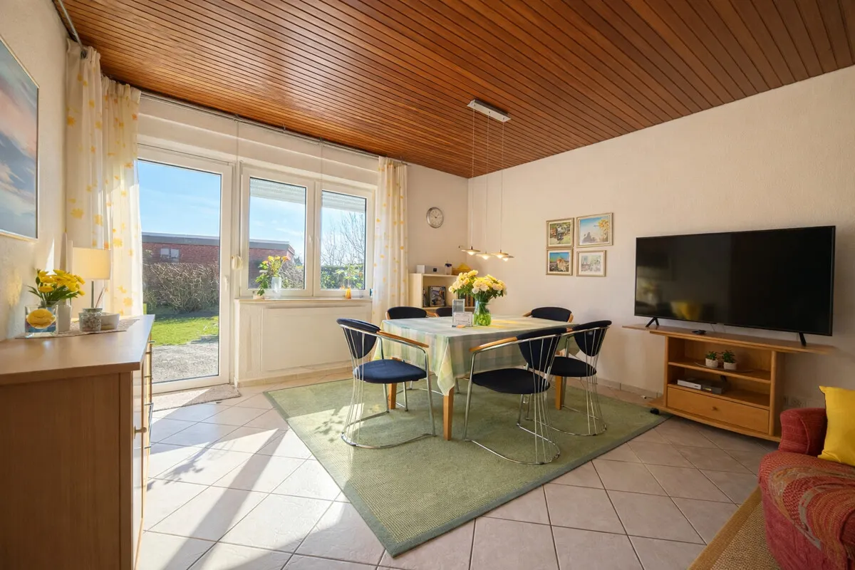 Auf ca. 54 m² Wohnfläche erwartet Sie ein durchdachter Grundriss mit Diele, einer Küche mit Einbauküche, einem Kinderzimmer, einem Schlafzimmer sowie einem Badezimmer mit Tageslicht. Das helle Wohn- und Esszimmer bildet das Herzstück des Hauses und bietet direkten Zugang zur sonnigen Terrasse – der ideale Ort, um die frische Nordseeluft zu genießen.