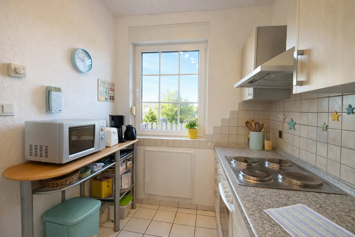 Die vorhandene Einbauküche ist im Kauf enthalten und bietet eine funktionale Grundlage für den täglichen Bedarf. Das Badezimmer verfügt über Tageslicht und sorgt für eine angenehme Atmosphäre. Ergänzt wird das Angebot durch eine Garage direkt am Haus. Ein Gasanschluss liegt bereits an der Immobilie an, ebenso befindet sich ein Glasfaseranschluss direkt in der Straße, sodass auch moderne Anforderungen an die Infrastruktur erfüllt sind.