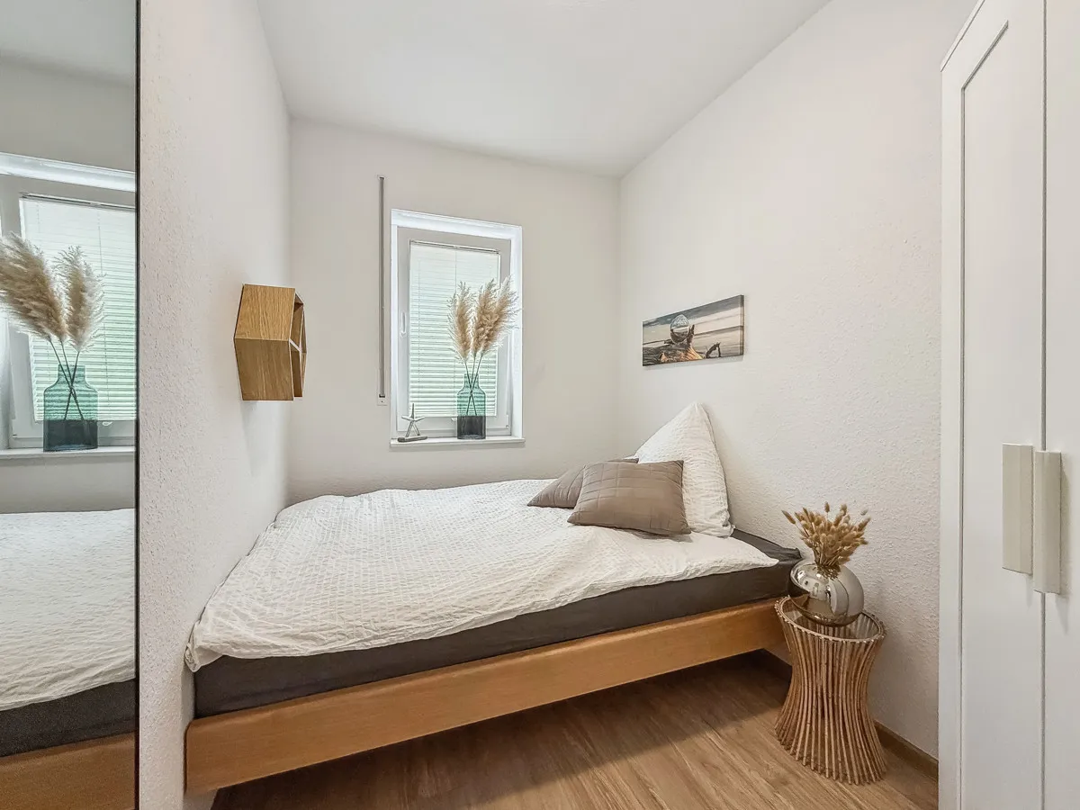 Beim Betreten der Wohnung gelangen Sie zunächst in eine helle Diele. Von hier aus erschließen sich ein Schlafzimmer, ein Kind-/ oder Gästezimmer, der Wohnbereich verbindet Wohn- und Esszimmer harmonisch miteinander und geht nahtlos in die moderne Küche über. Von hier aus haben Sie direkten Zugang zur Terrasse und in den Garten. Besonders praktisch ist der innenliegende Abstellraum, der mit einer Waschmaschine ausgestattet ist und zusätzlichen Stauraum für viele Dinge des Alltags bietet.