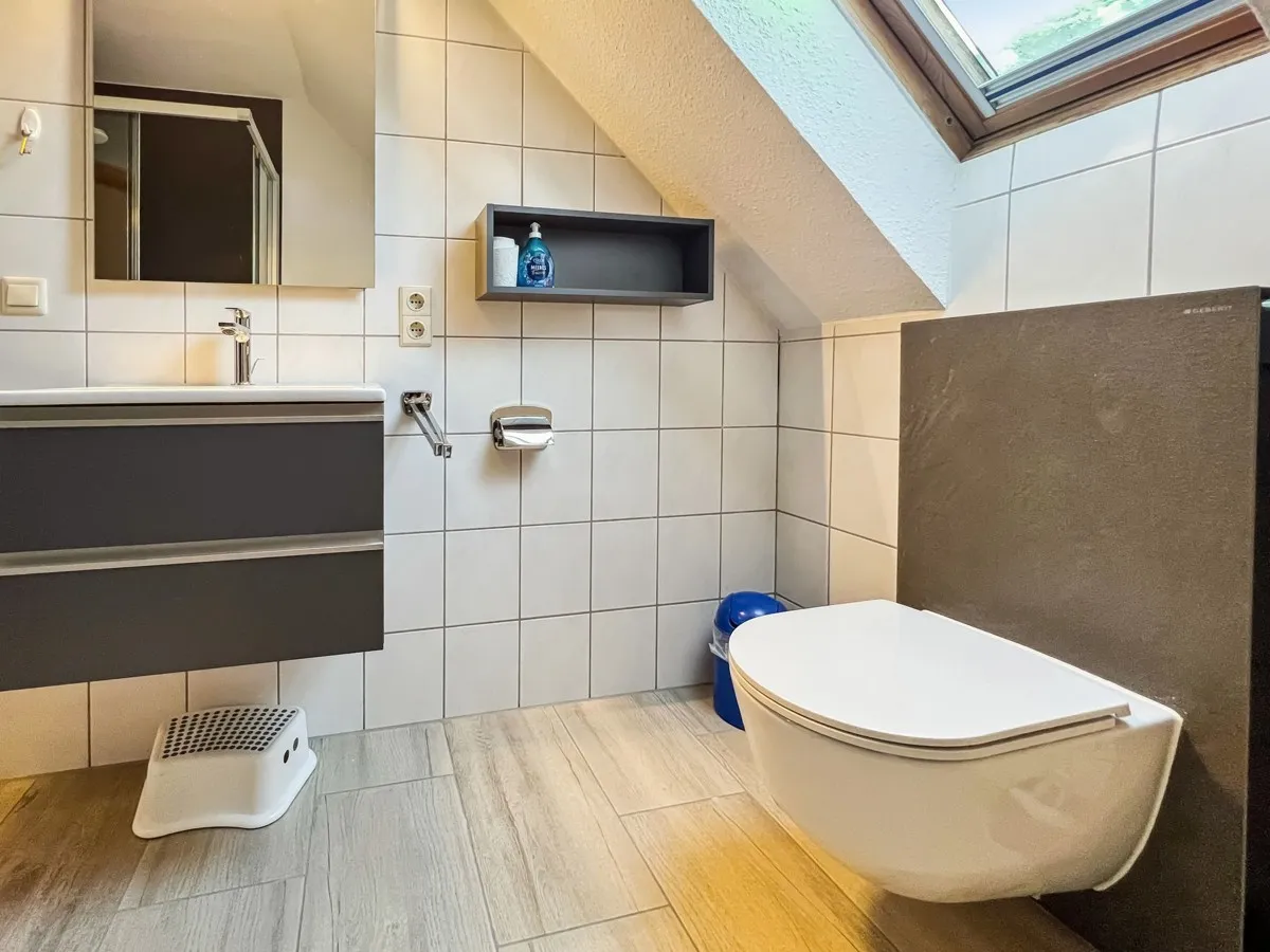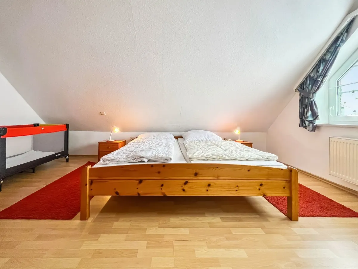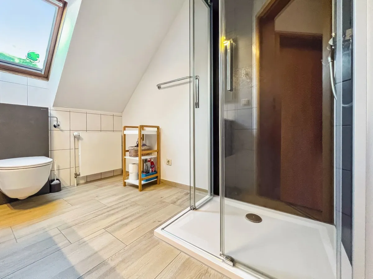 Obergeschoss: Schlafzimmer, neues Badezimmer (2022) mit bodentiefer Dusche, schönes Erkerzimmer für Gäste und Kinder; alle Räume sind sehr hell und freundlich; der Spitzboden ist begehbar und gedämmt. Im Spitzboden befindet sich auch die Gastherme.
