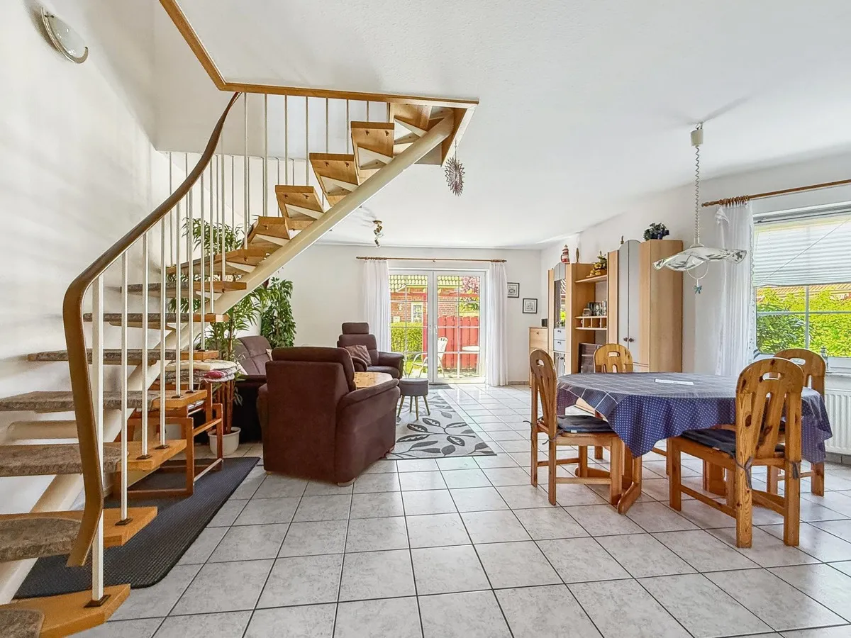 Erdgeschoss: Diele, Gäste-WC, Abstellraum, schickes Wohn/-Esszimmer zum Garten, Terrasse, Küche mit Einbauküche, Aufgang zum Obergeschoss
