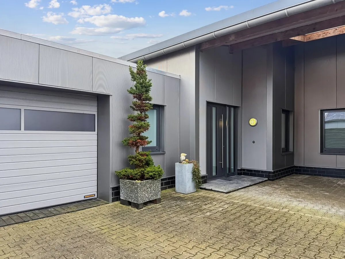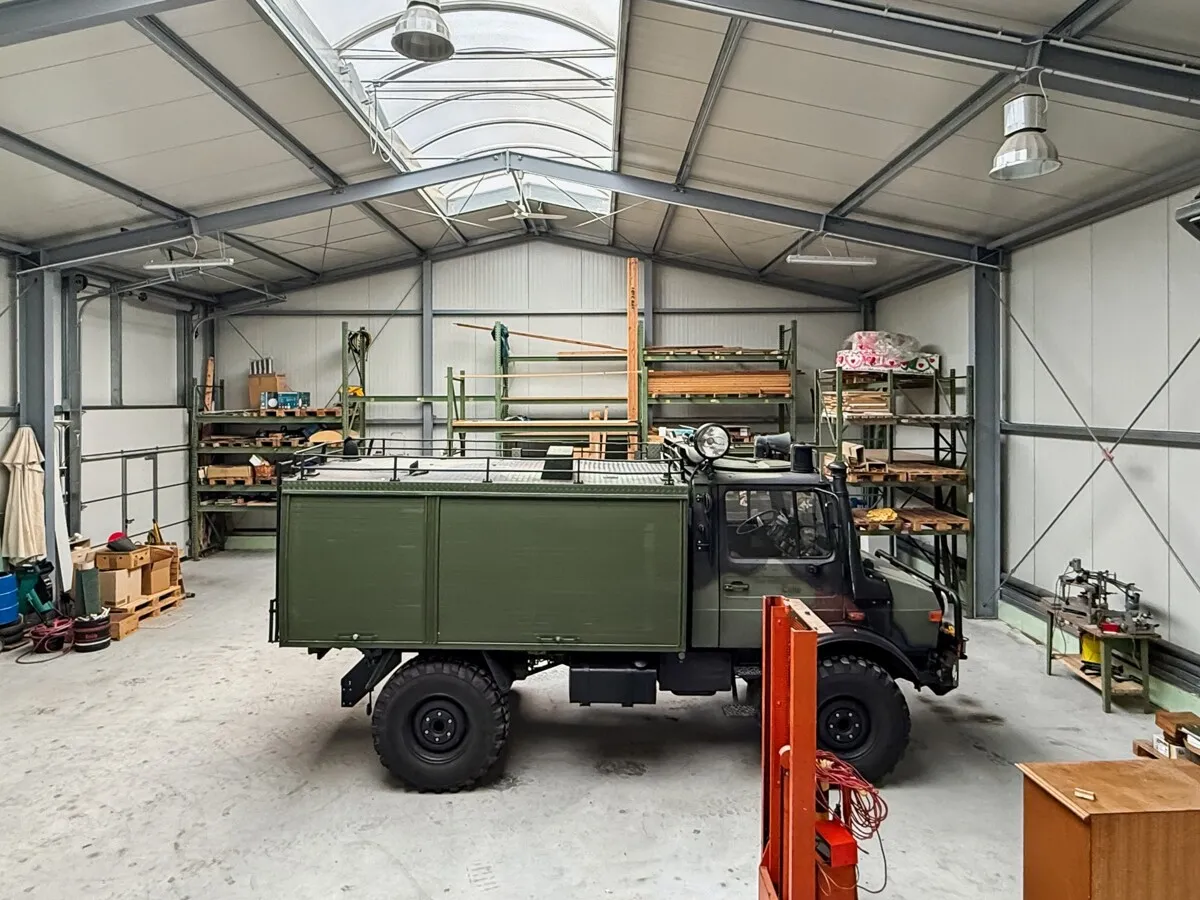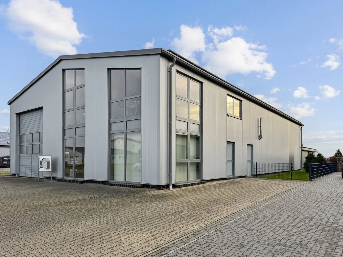 Der Gewerbebereich mit ca. 400 m² umfasst eine hochwertige Stahlhalle in kompletter Stahlkonstruktion mit ISO-Wandelementen und durchgehender Wärmedämmung, Büro- und Ladenflächen im Erd- und Obergeschoss, eine voll ausgestattete Küche sowie moderne Sanitärräume.