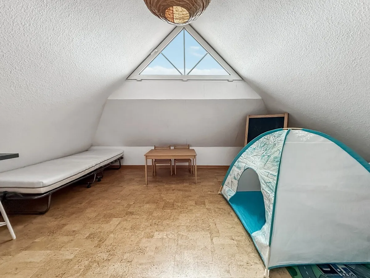 Über eine geschlossene Steintreppe erreichen Sie das Obergeschoss, das mit einem großzügigen Elternschlafzimmer, einem Badezimmer sowie einem gemütlichen Kinderzimmer überzeugt. Von hier führt ein Aufgang in den ausgebauten Abstellraum (Nutzfläche) im Spitzboden der gerne als Spielzimmer genutzt wird.