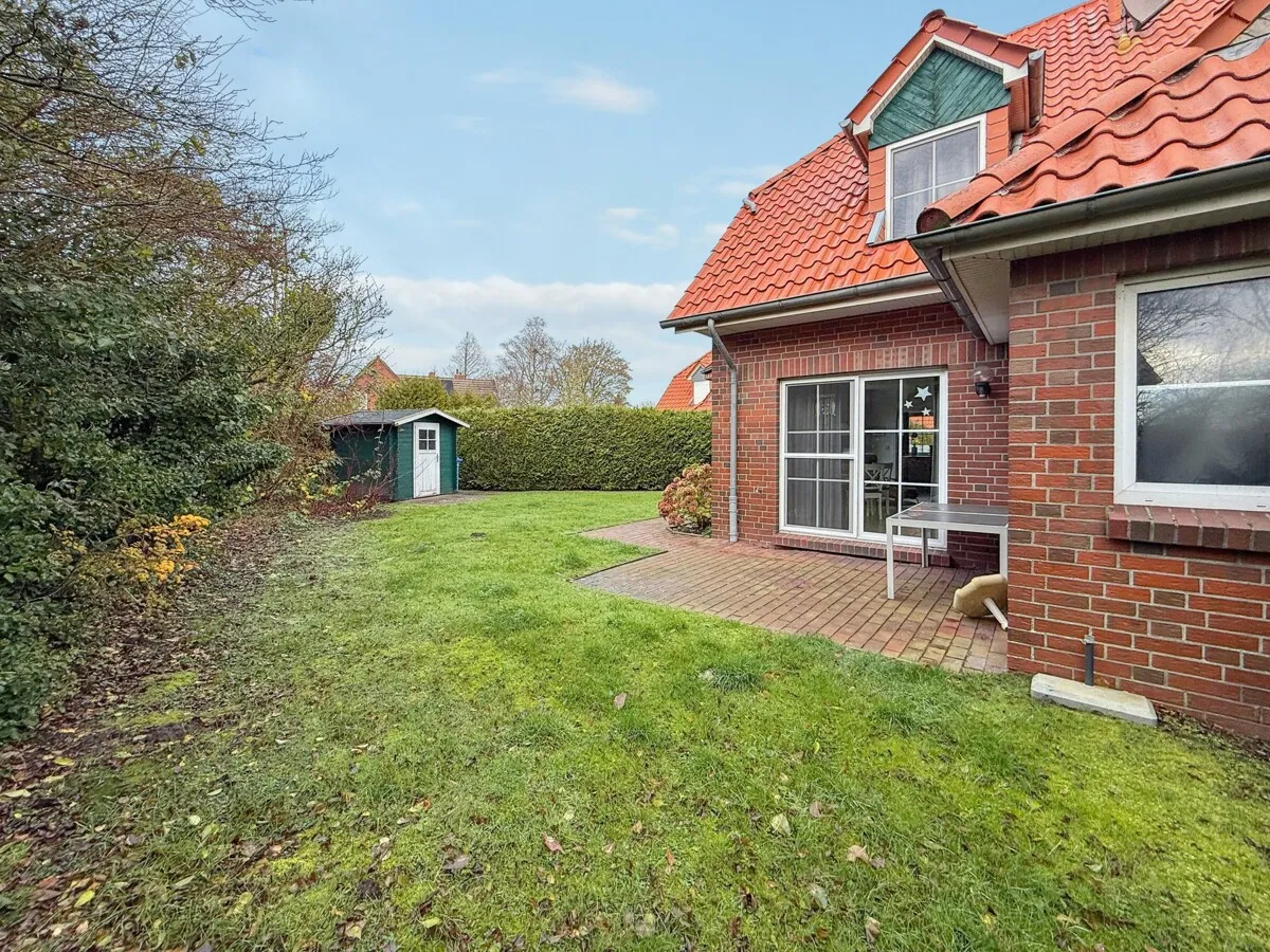 Direkt an der Terrasse befindet sich ein praktischer Außen-Abstellraum, ergänzt durch ein Gartenhaus im hinteren Grundstücksbereich, das zusätzlichen Stauraum für Fahrräder und Gartengeräte bietet. Vor dem Haus gibt es einen großzügigen PKW-Stellplatz.