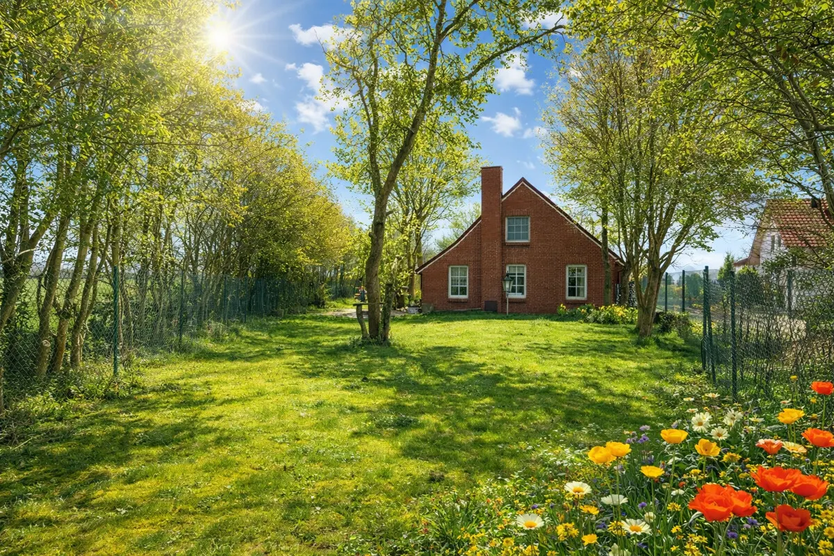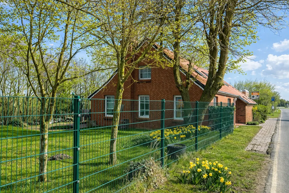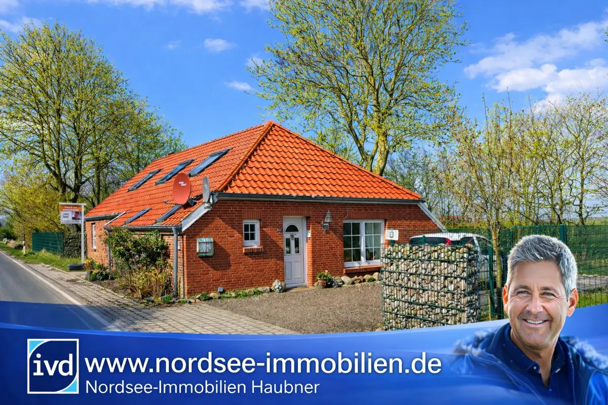 Auf einem ca. 841 m² großen Grundstück befindet sich das idyllische, in den letzten Jahren immer wieder renovierte Landhaus. Das charmante Anwesen liegt an der Küstenstraße nur wenige hundert Meter vom Deich entfernt und bietet einen freien Weitblick.