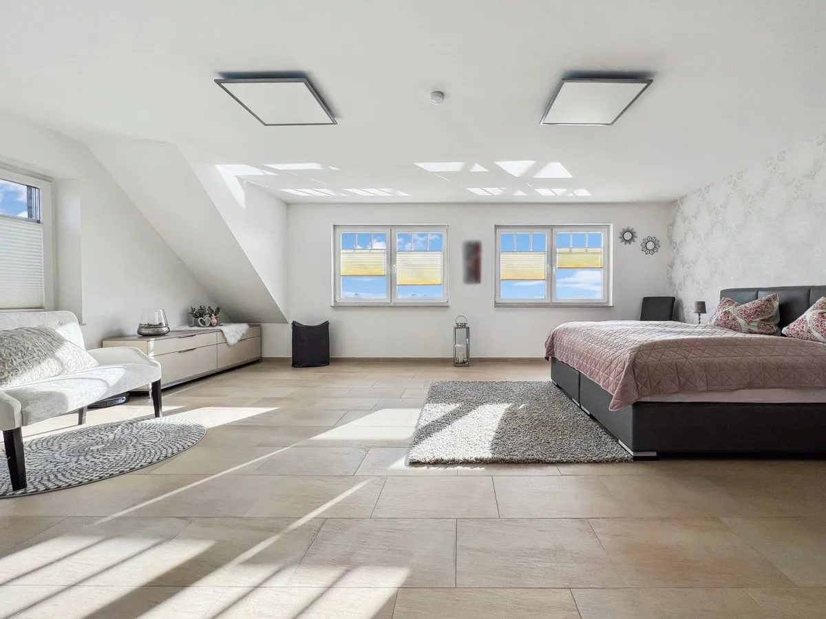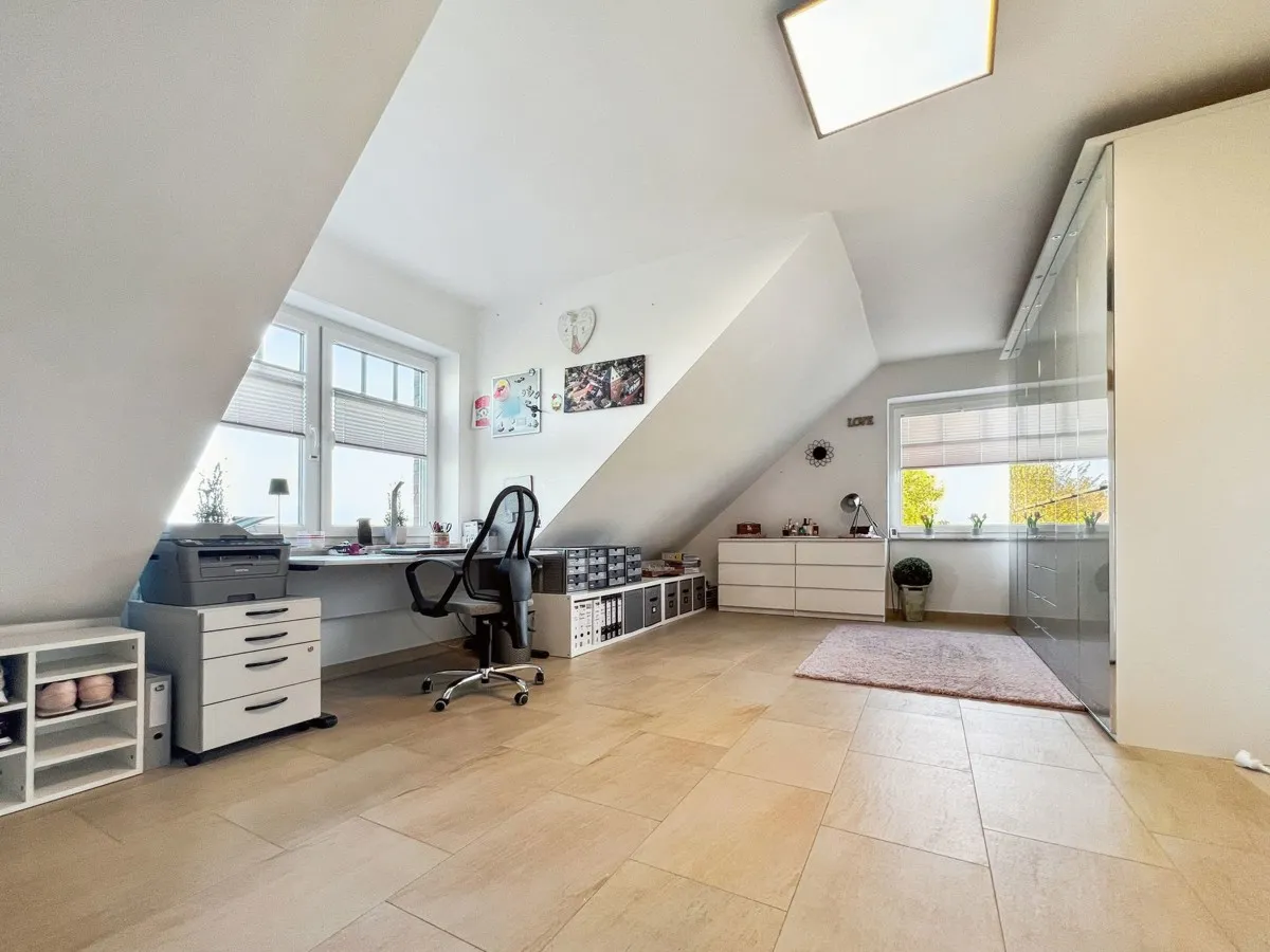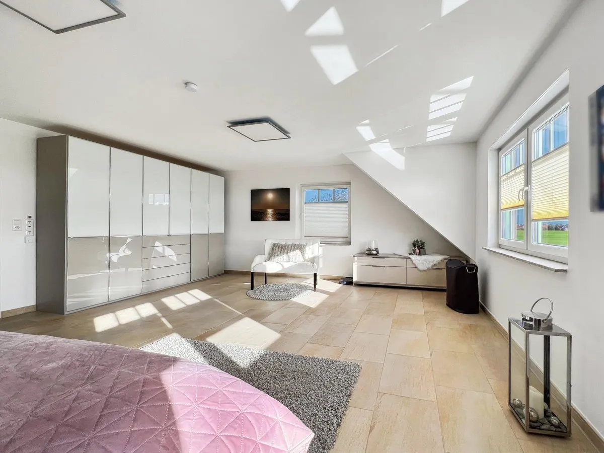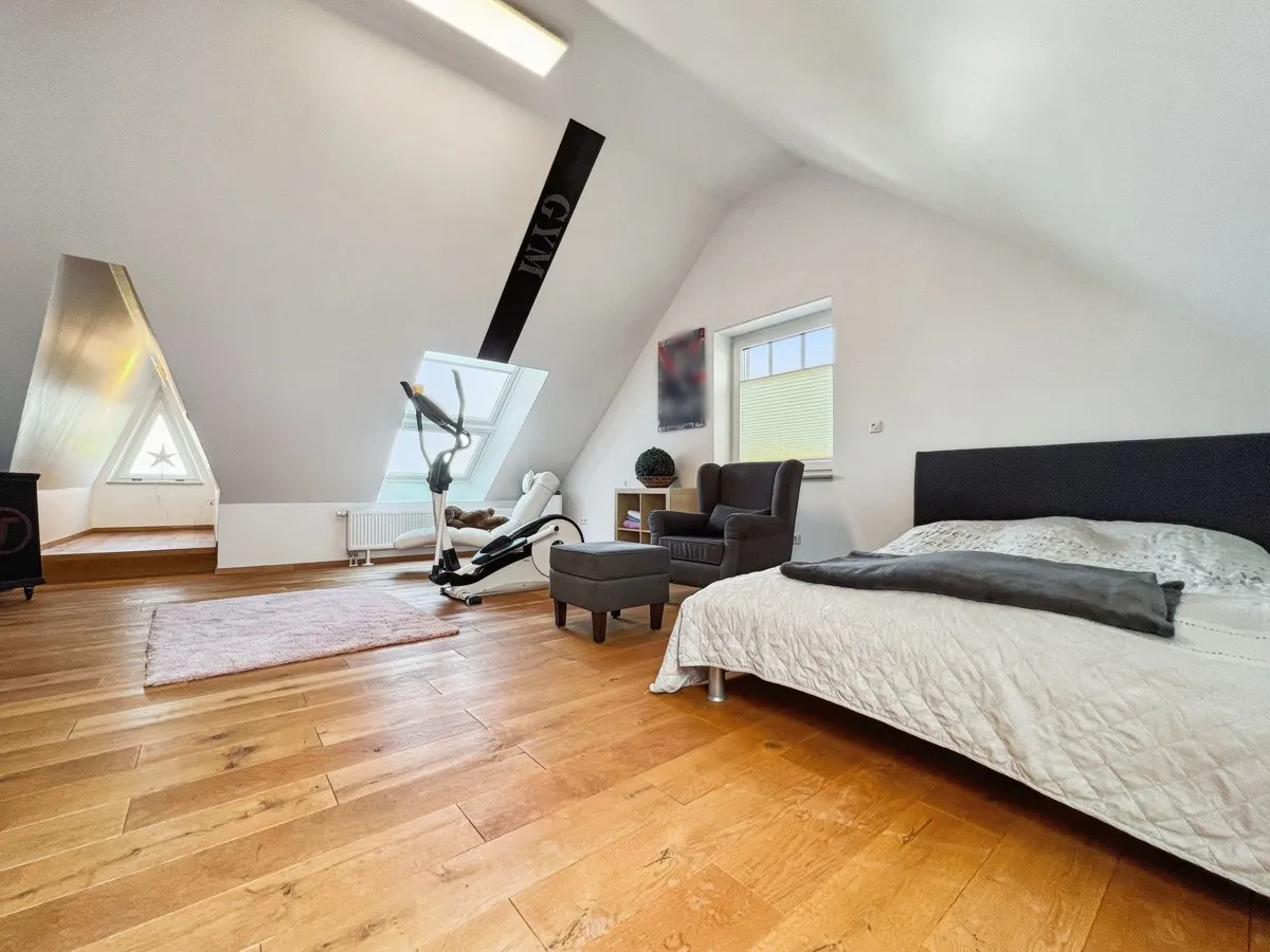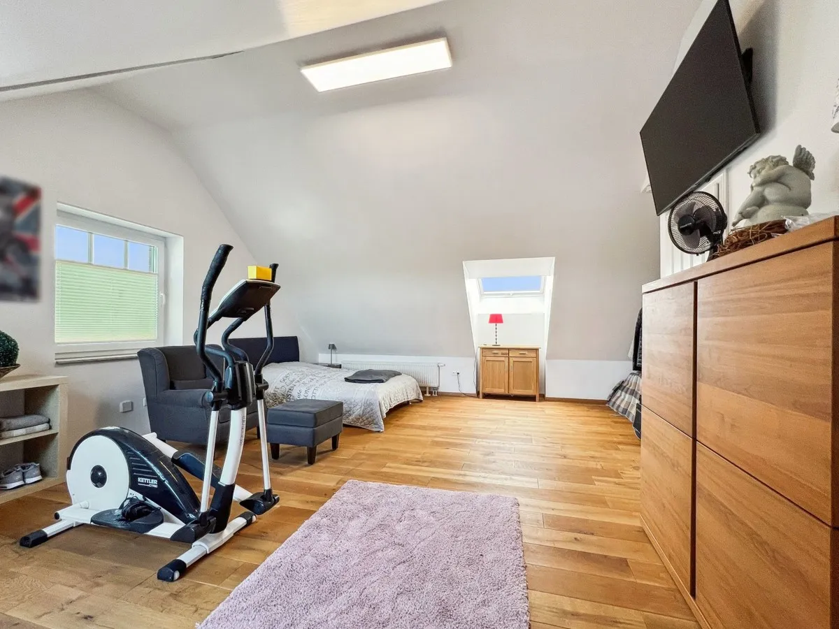 Im Obergeschoss finden Sie ein atemberaubendes Elternschlafzimmer mit einem herrlichen Ausblick, ein schickes Badezimmer mit Wanne u. Dusche sowie einen geräumigen Kinder/Gastbereich. Über eine schöne Treppe gelangen Sie in den aufwendig ausgebauten Spitzboden mit Parkettboden. Hier erwarten Sie weitere ca. 30 m² Nutzfläche mit Meerblick. Aktuell wurde der Spitzboden als kombinierter Gäste-/und Fitnessbereich genutzt. Anschluss für eine Klimaanlage ist vorhanden.