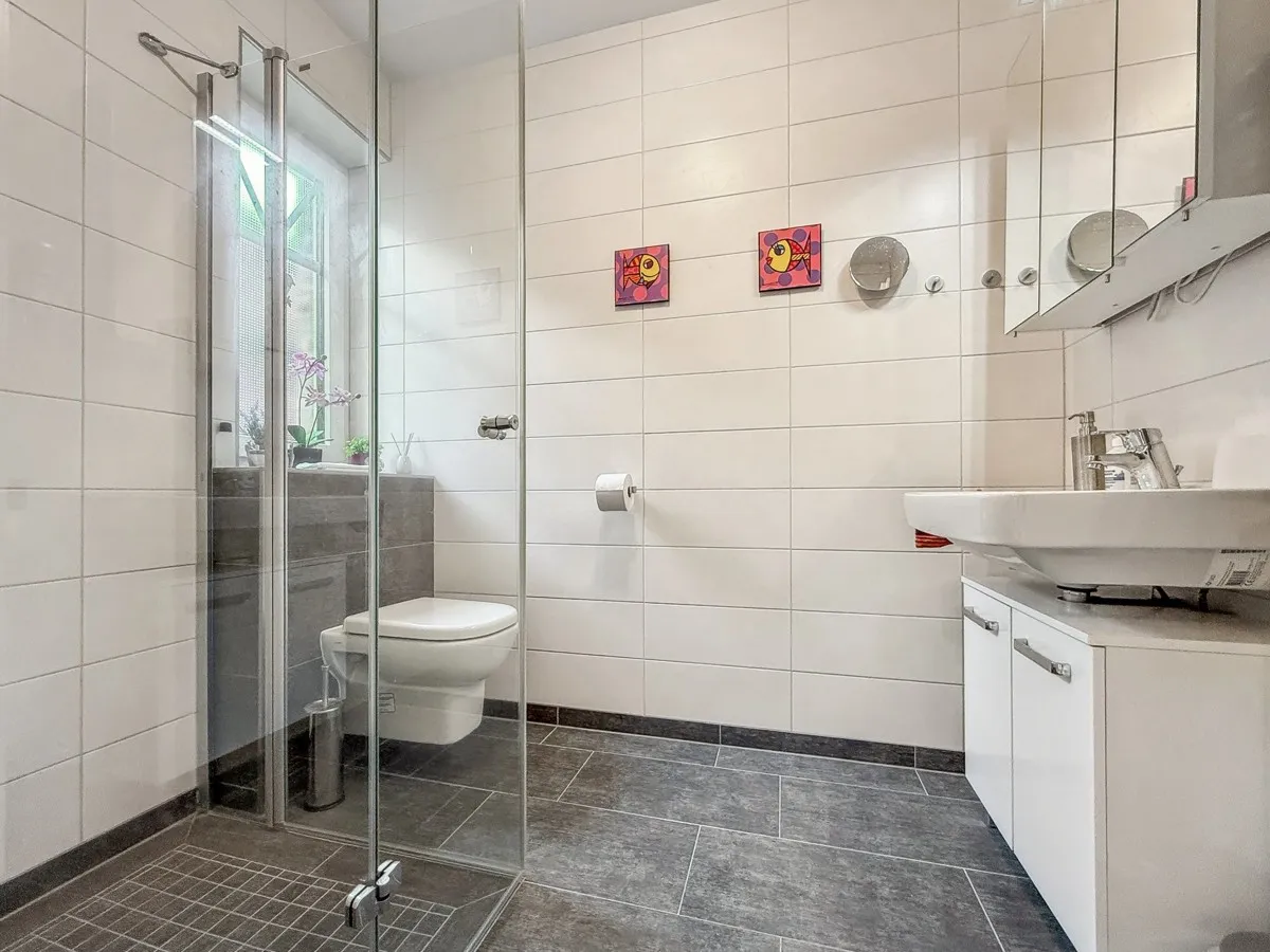 Die Raumaufteilung überzeugt: Vom Eingangsbereich aus gelangen Sie in ein modernes Tageslichtbad mit großzügiger, begehbarer Dusche. Das Elternschlafzimmer sowie ein weiterer Raum, ideal als Gästezimmer oder Büro nutzbar, bieten ausreichend Platz. Der offene Wohnraum mit Zugang zur sonnigen Terrasse und dem herrlichen Garten lädt zum Entspannen und Genießen ein. Die stilvolle Küche mit moderner Einbauküche und Essbereich wurde harmonisch in den Wohnbereich integriert. Ein Hauswirtschaftsraum mit Waschmaschine und praktischen Regalen sorgt für zusätzlichen Stauraum.