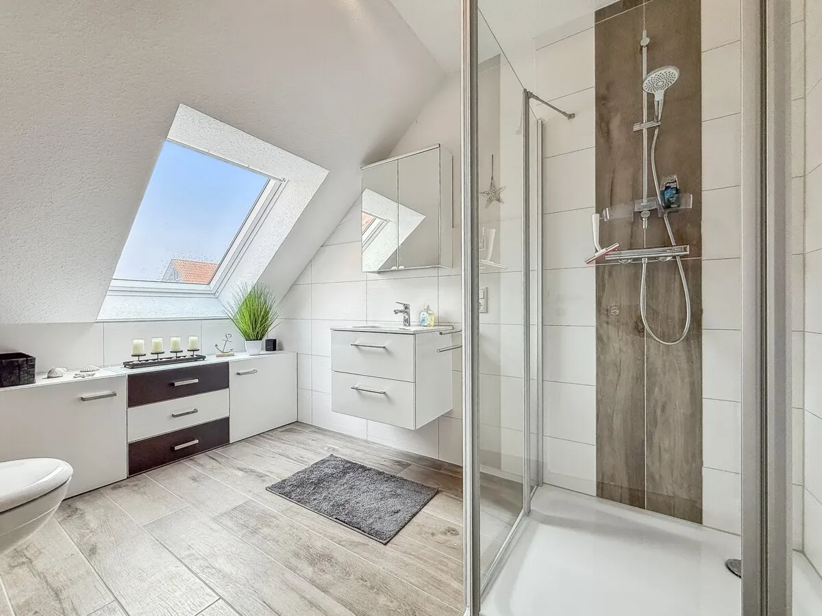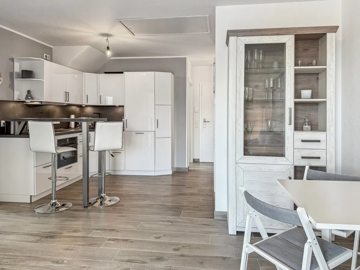 Die Wohnung verfügt über zwei Schlafzimmer, ein modernes Tageslichtbad mit ebenerdiger Dusche sowie einen hellen Wohnbereich mit offener Küche. Die hochwertige Einbauküche ist mit Geräten von NEFF ausgestattet und erfüllt höchste Ansprüche. Vom Wohnbereich gelangen Sie auf den großzügigen Balkon mit Blick bis zur Insel Baltrum. Ein Hauswirtschaftsraum bietet Platz für Waschmaschine und Vorräte. Zur Wohnung gehört noch ein interessanter Spitzboden direkt über der Wohnung.