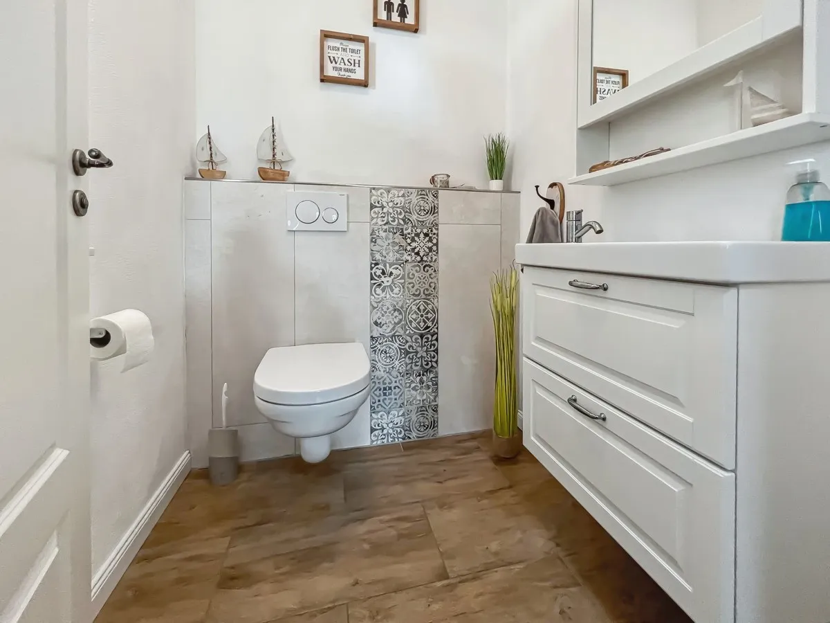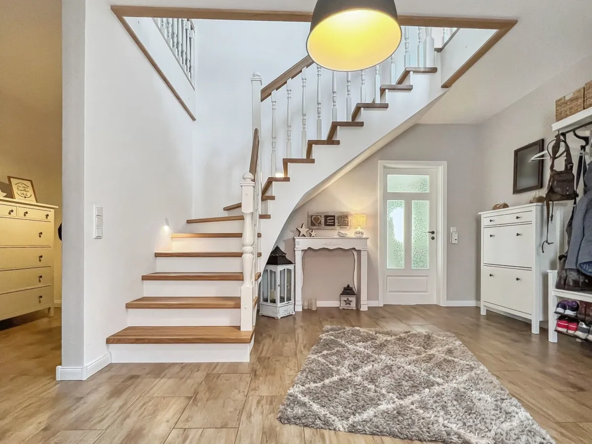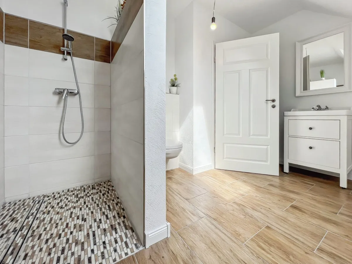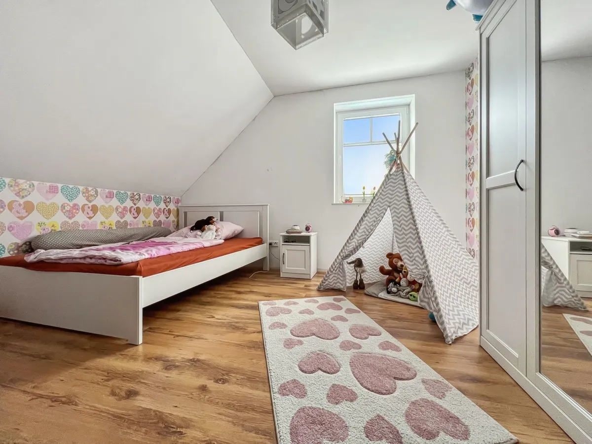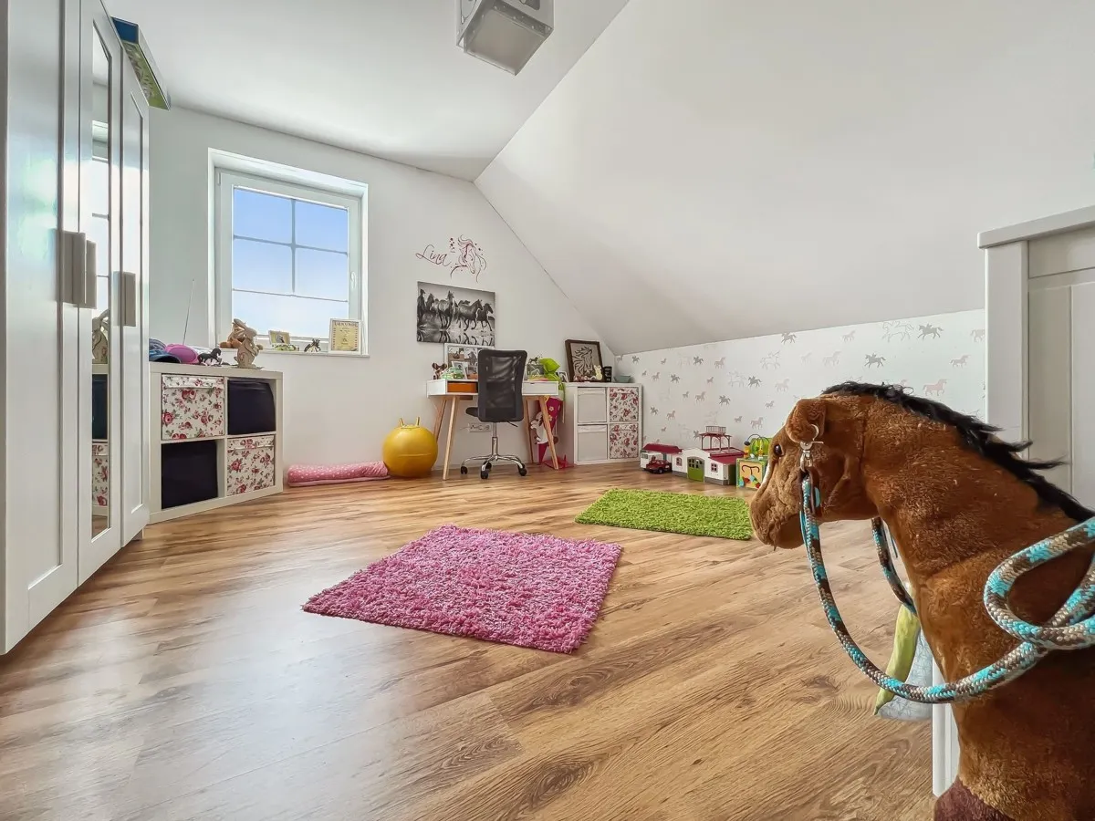 Über eine wunderschöne Treppe gelangen Sie in das Obergeschoss. Hier finden Sie ein Schlafzimmer, ein Gästezimmer, zwei Kinderzimmer sowie ein weiteres Badezimmer mit begehbarer Dusche das keine Wünsche offenlässt. Die Fußbodenheizung im Haus sorgt für ein wohliges Wohngefühl. Für die Heizungsanlage mit 800 L. Warmwasserspeicher gibt es einen separaten Abstellraum.