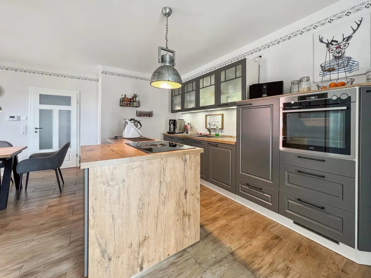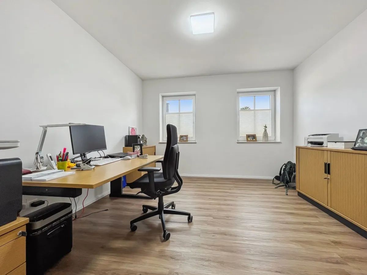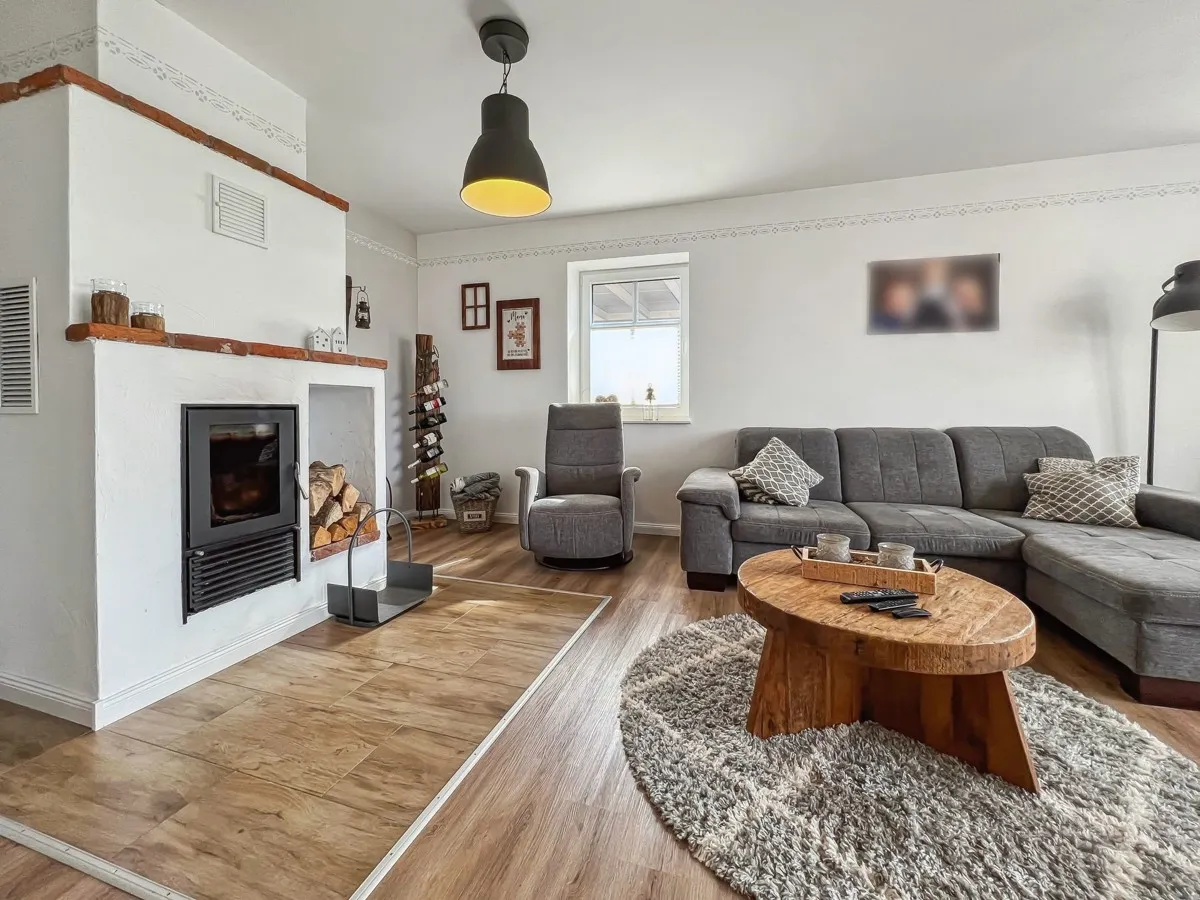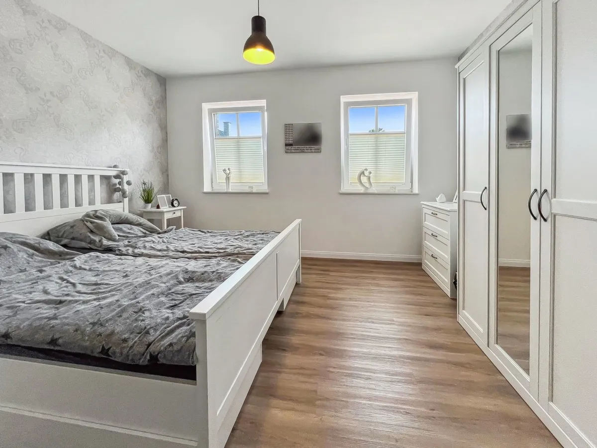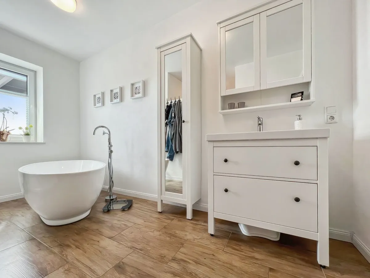Das repräsentative Wohnzimmer im Erdgeschoss wurde mit einem hochwertigen wasserführenden Kamin ausgestattet. Direkt daneben liegt die moderne Wohnküche mit Kochinsel, Induktionskochfeld inkl. leistungsstarkem Dunstabzug und Essbereich. Ein besonderes Highlight ist die überdachte Terrasse und eine ca. 9 x 8 Meter große Garage mit Nebenraum und direktem Zugang zum Haus. Ein Hauswirtschaftsraum, ein hochwertiges Gäste-WC, ein Schlafzimmer/Büro sowie ein Luxus-Badezimmer mit begehbarer Dusche und freistehender Wanne komplettieren das Erdgeschoss.